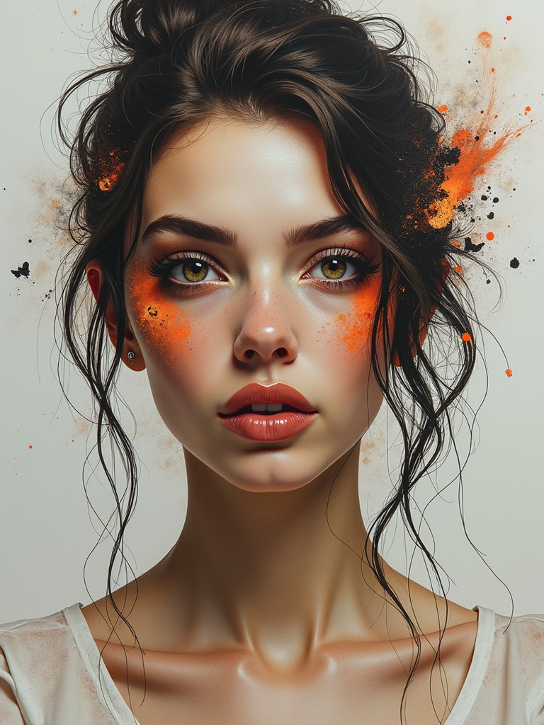 Full body portrait of model as a mixed media artwork. Combined techniques, artistic depth . Gallery quality art.