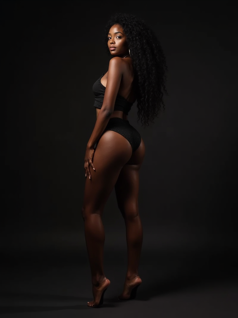 Full body portrait of model in studio lighting. Sensual stance, figure-hugging outfit . Professional studio setup, dramatic lighting.