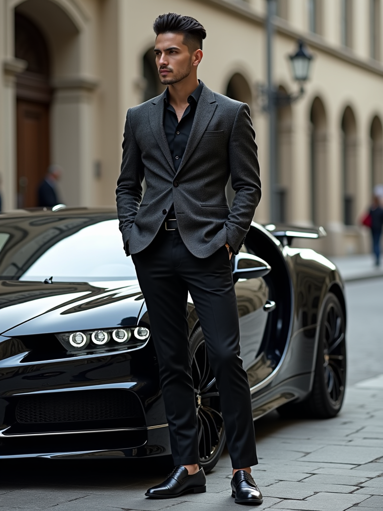Full-body shot of a confident model standing next to a bugatti sports car. mans wears luxurious clothes