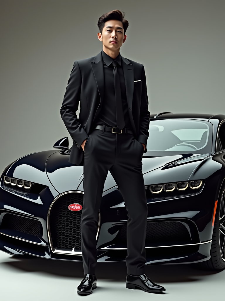 Full-body shot of a confident model standing next to a bugatti sports car. mans wears luxurious clothes