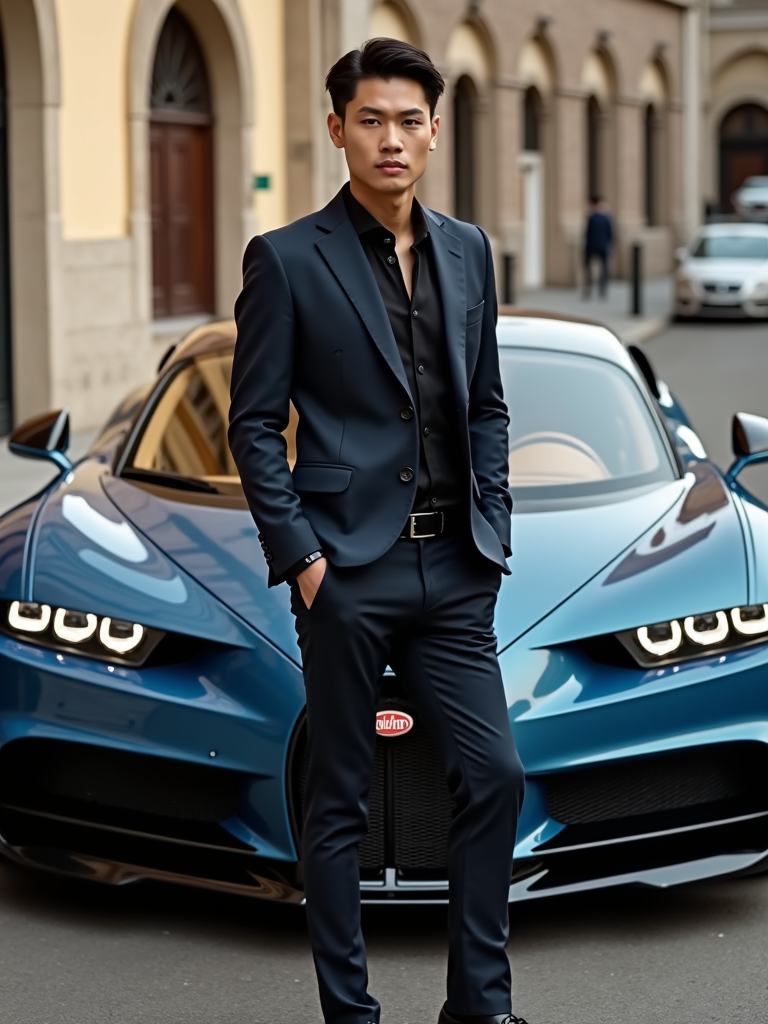 Full-body shot of a confident model standing next to a bugatti sports car. mans wears luxurious clothes