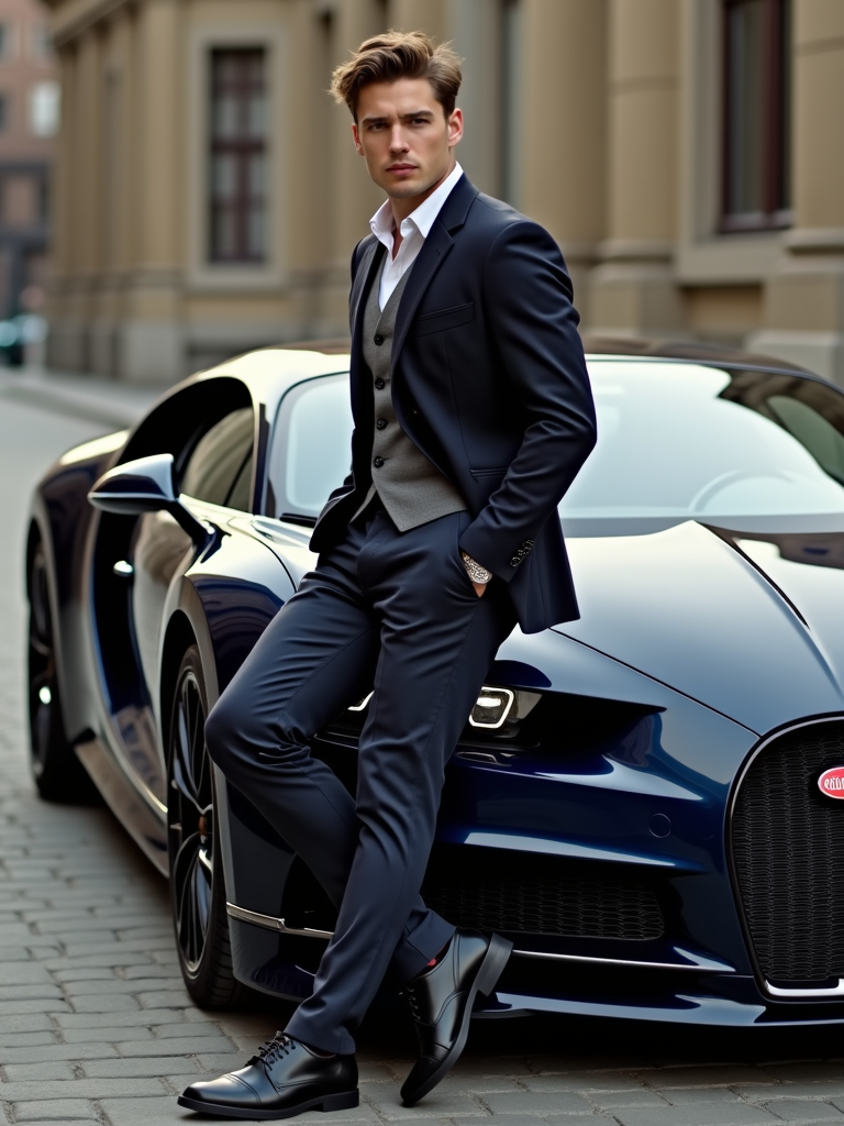 Full-body shot of a confident model standing next to a bugatti sports car. mans wears luxurious clothes