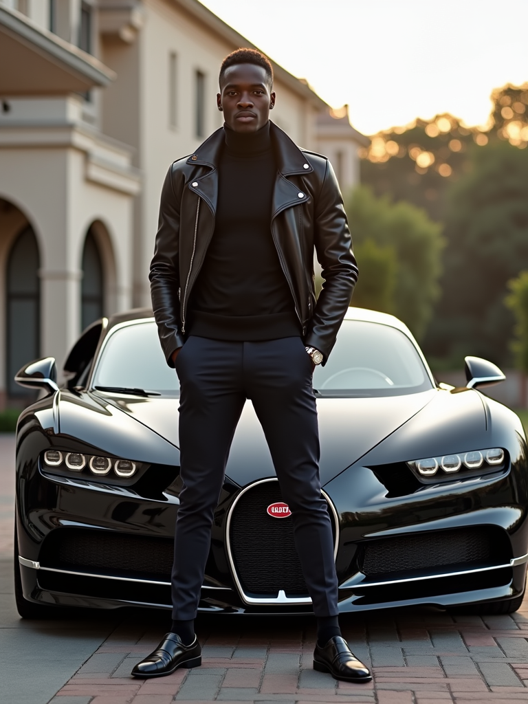 Full-body shot of a confident model standing next to a bugatti sports car. mans wears luxurious clothes