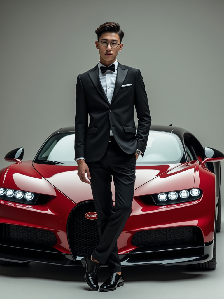 Full-body shot of a confident model standing next to a bugatti sports car. mans wears luxurious clothes