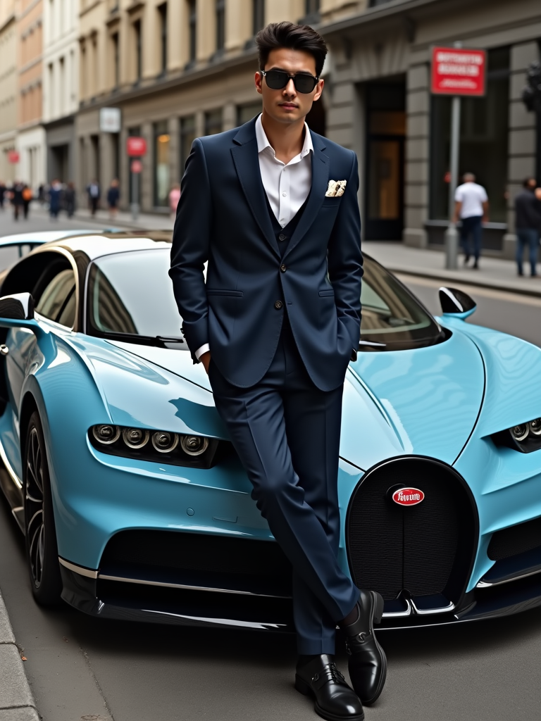 Full-body shot of a confident model standing next to a bugatti sports car. mans wears luxurious clothes