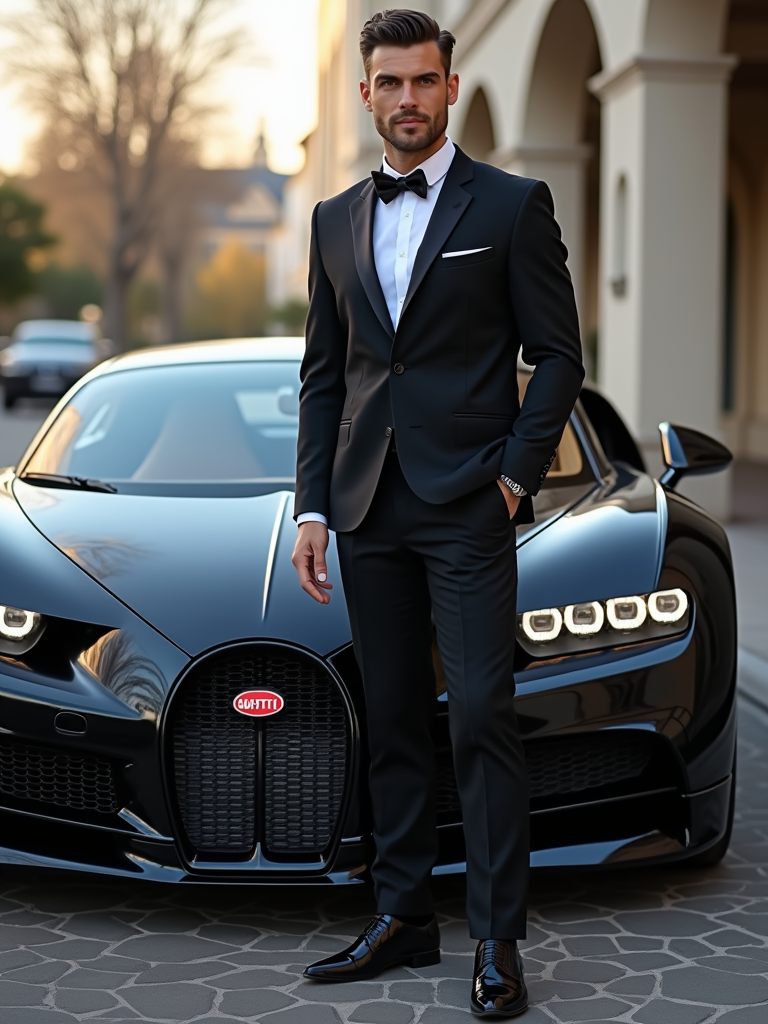 Full-body shot of a confident model standing next to a bugatti sports car. mans wears luxurious clothes