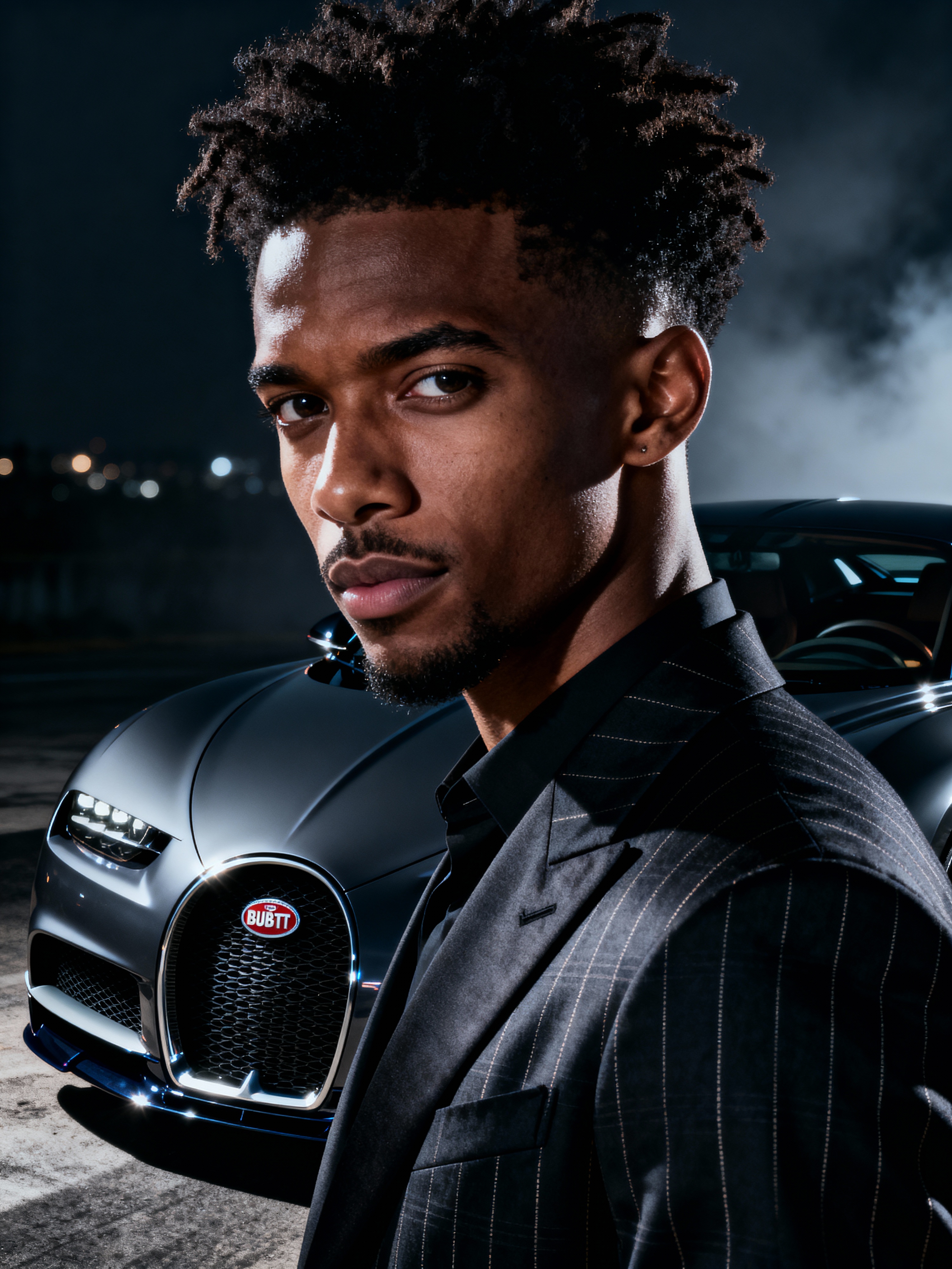 Full-body shot of a confident model standing next to a bugatti sports car. mans wears luxurious clothes