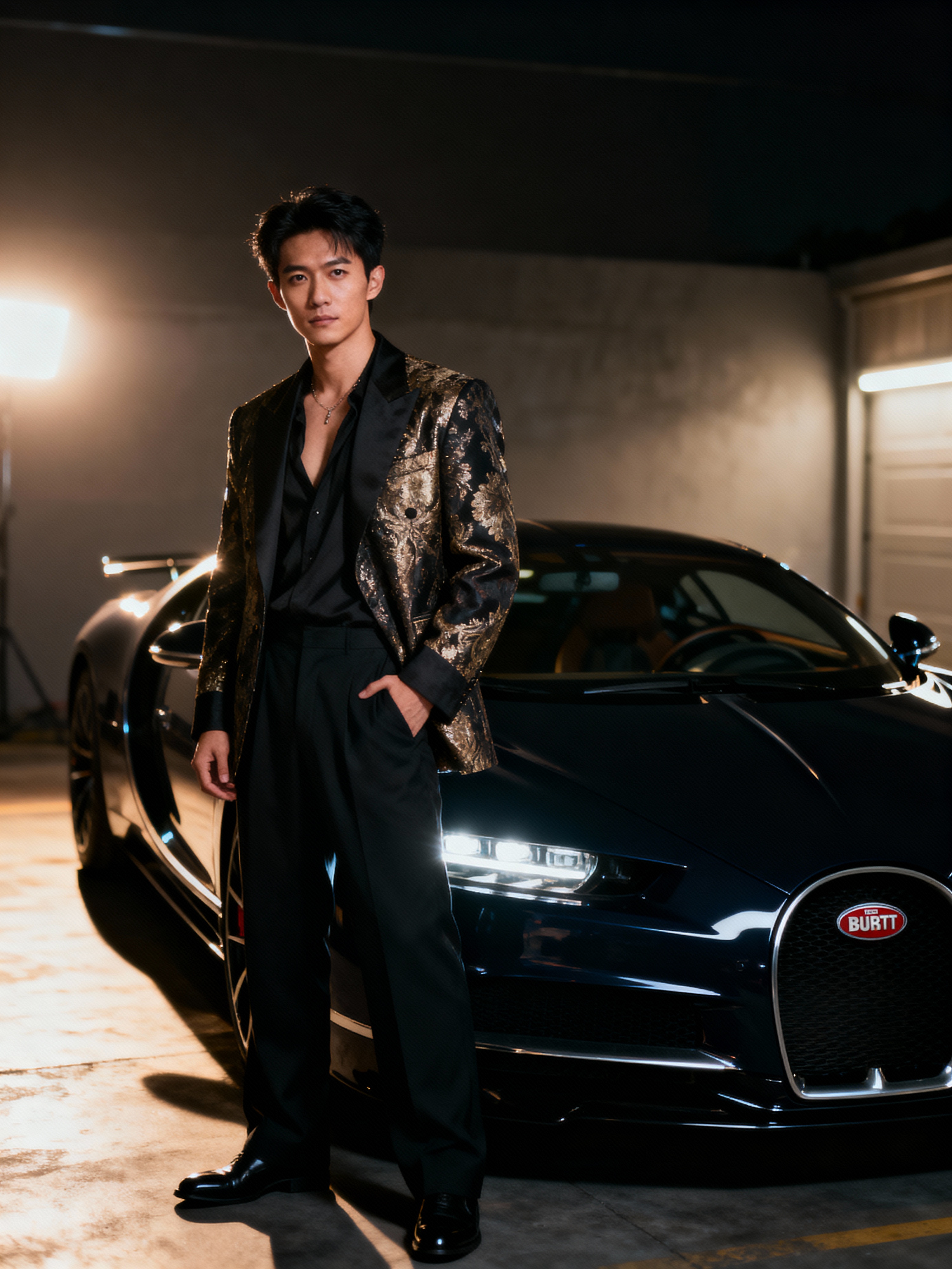Full-body shot of a confident model standing next to a bugatti sports car. mans wears luxurious clothes