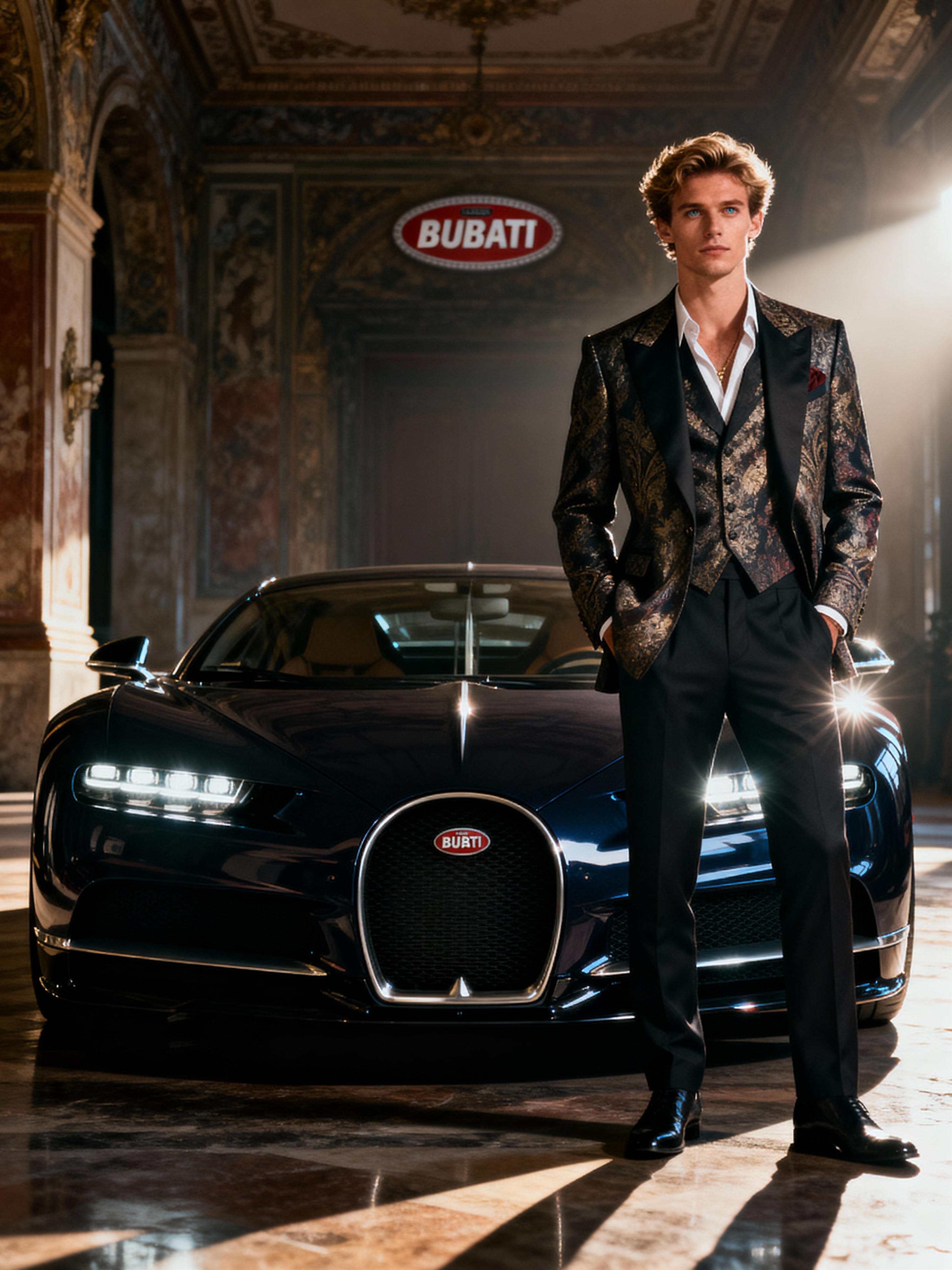 Full-body shot of a confident model standing next to a bugatti sports car. mans wears luxurious clothes