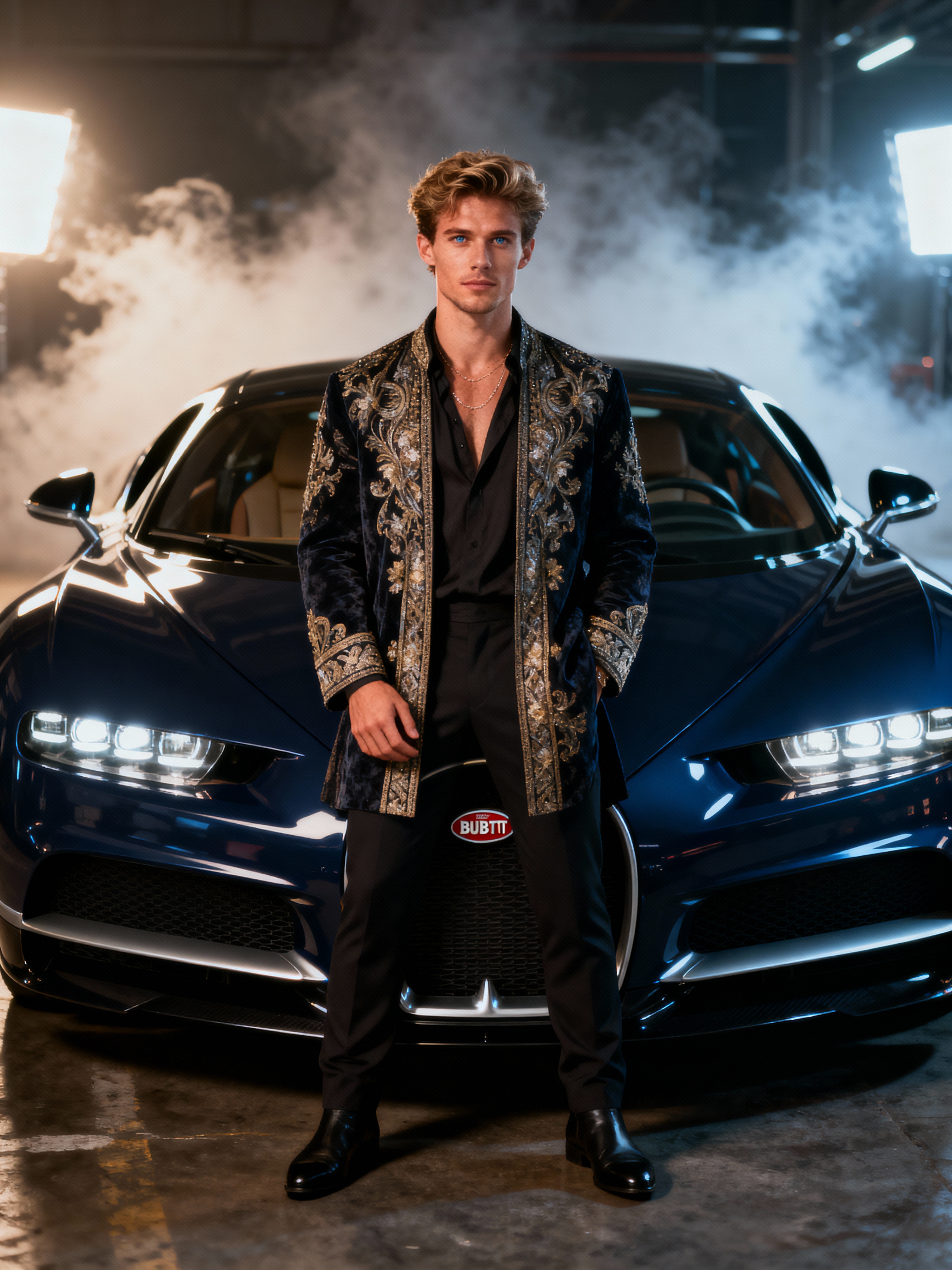 Full-body shot of a confident model standing next to a bugatti sports car. mans wears luxurious clothes