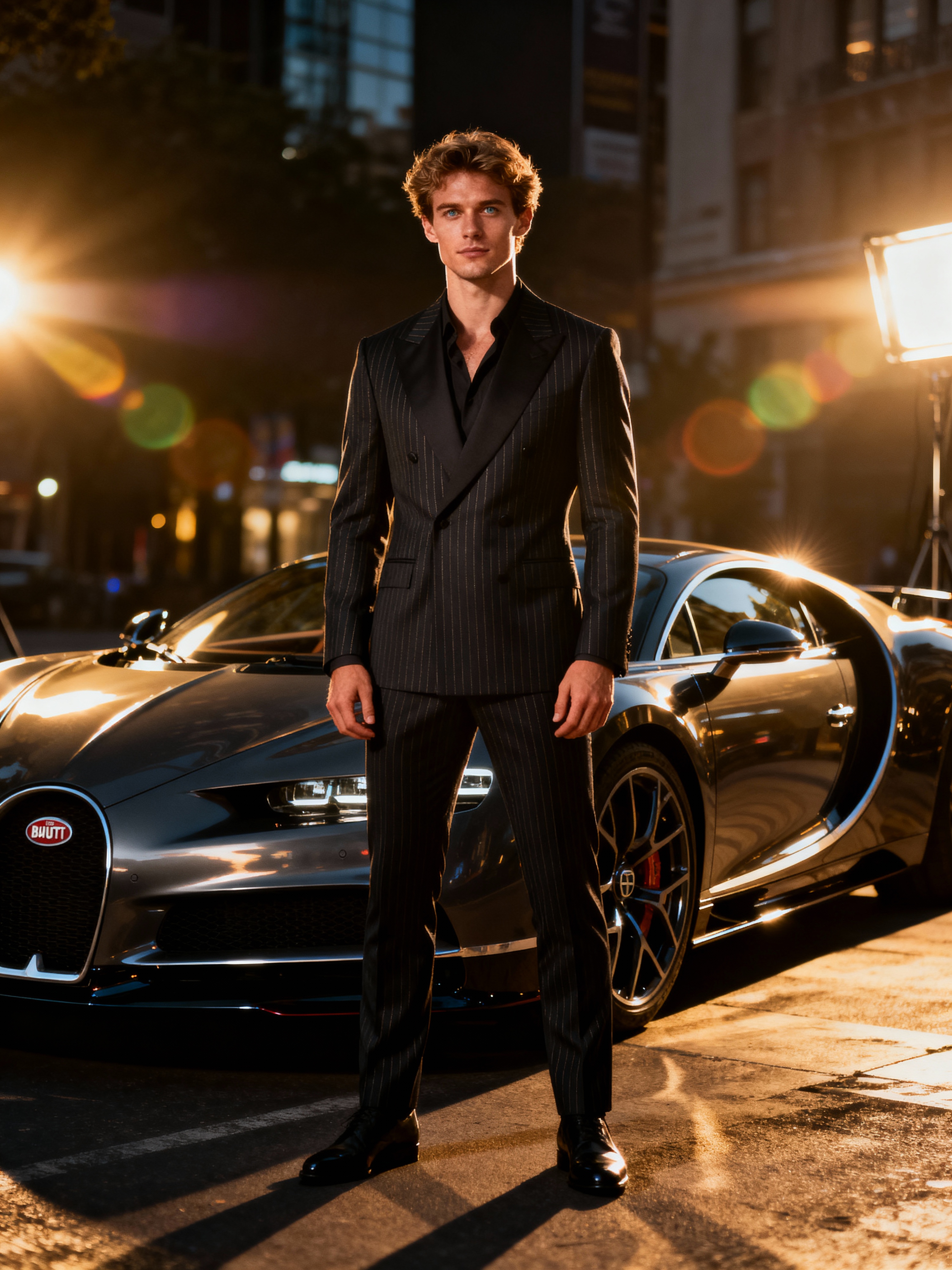 Full-body shot of a confident model standing next to a bugatti sports car. mans wears luxurious clothes