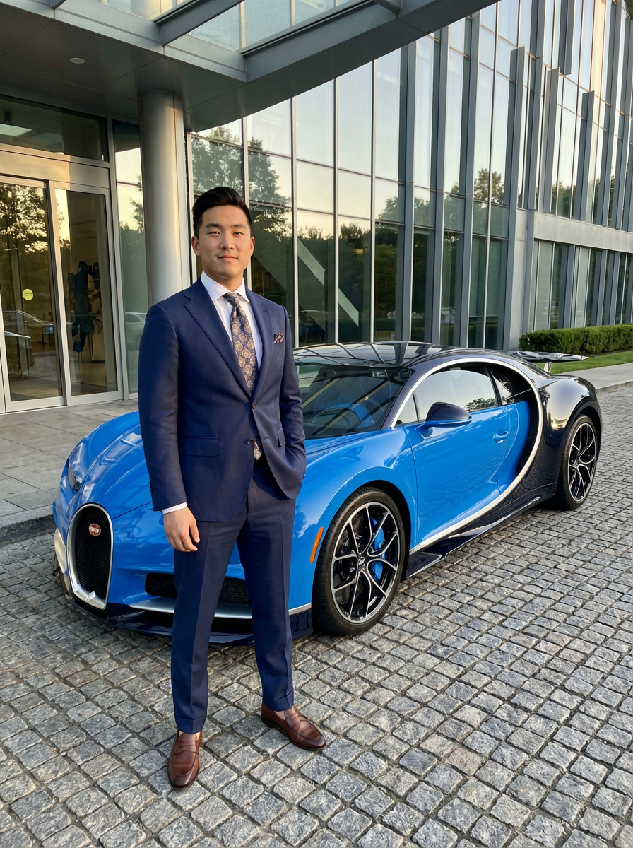 Full-body shot of a confident model standing next to a bugatti sports car. mans wears luxurious clothes