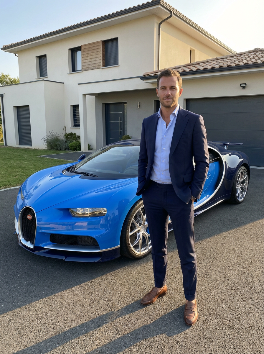 Full-body shot of a confident model standing next to a bugatti sports car. mans wears luxurious clothes