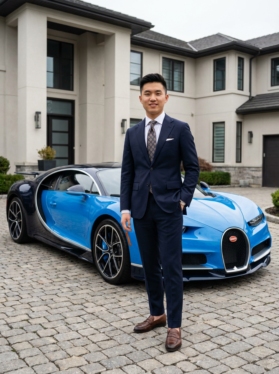 Full-body shot of a confident model standing next to a bugatti sports car. mans wears luxurious clothes