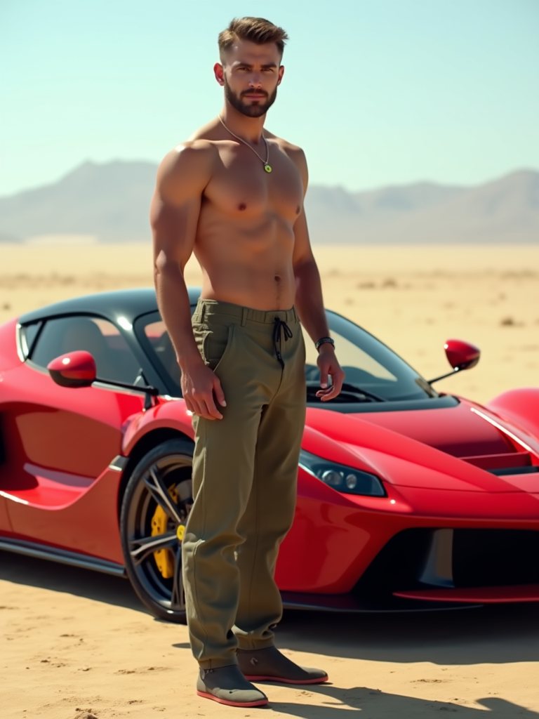 full-body shot of a confident model standing next to a red luxury ferrari sports car in a desert setting.