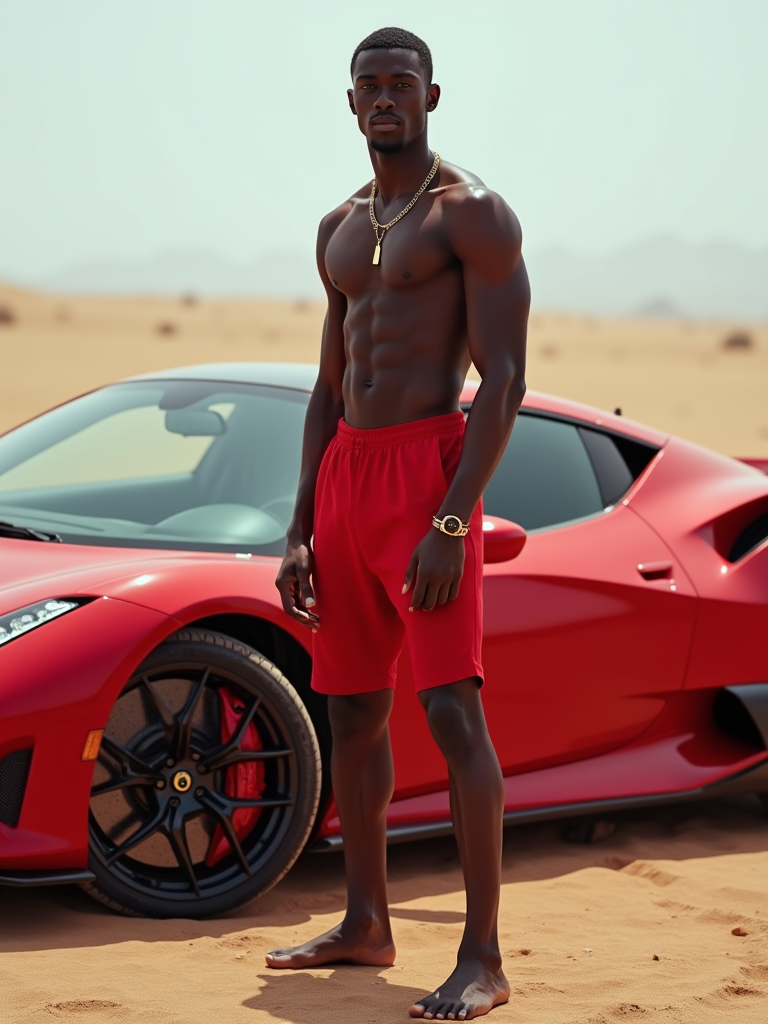 full-body shot of a confident model standing next to a red luxury ferrari sports car in a desert setting.