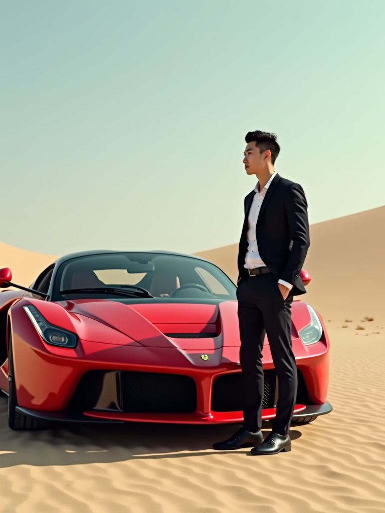 full-body shot of a confident model standing next to a red luxury ferrari sports car in a desert setting.