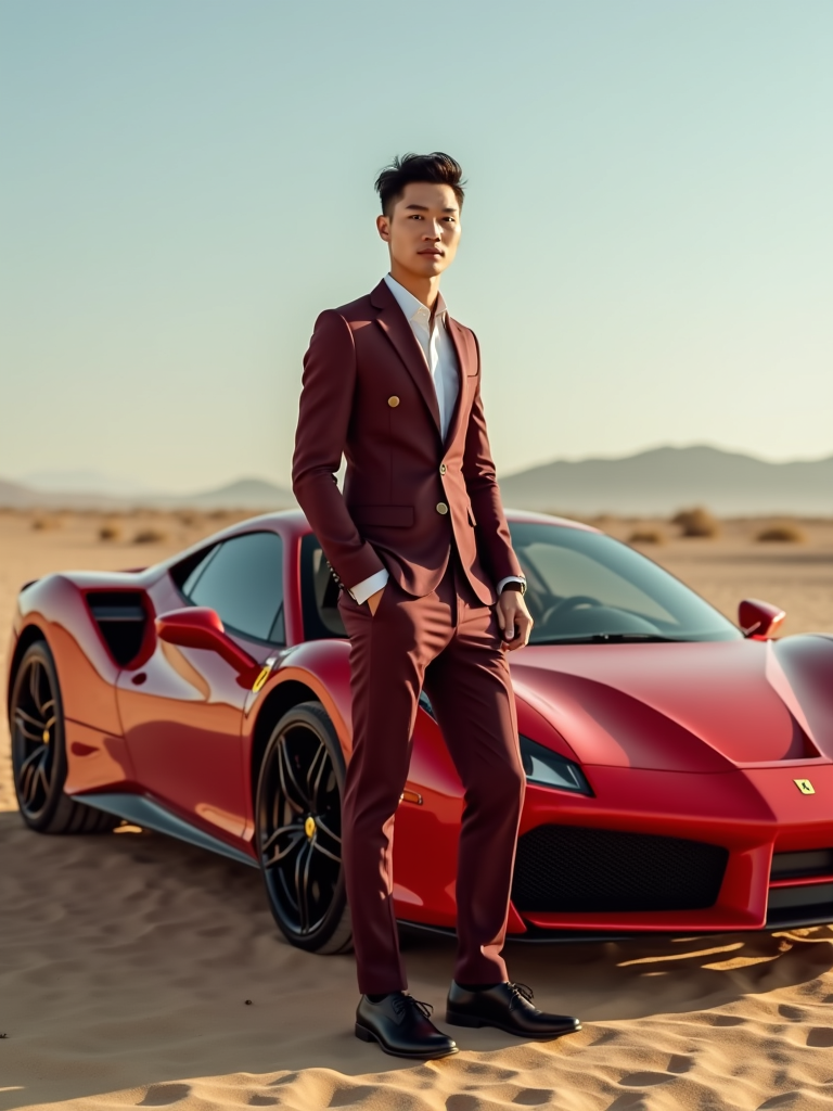 full-body shot of a confident model standing next to a red luxury ferrari sports car in a desert setting.