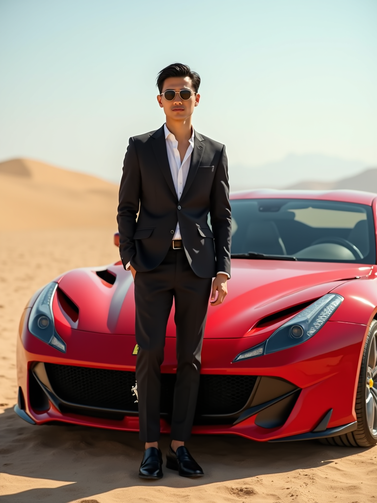 full-body shot of a confident model standing next to a red luxury ferrari sports car in a desert setting.