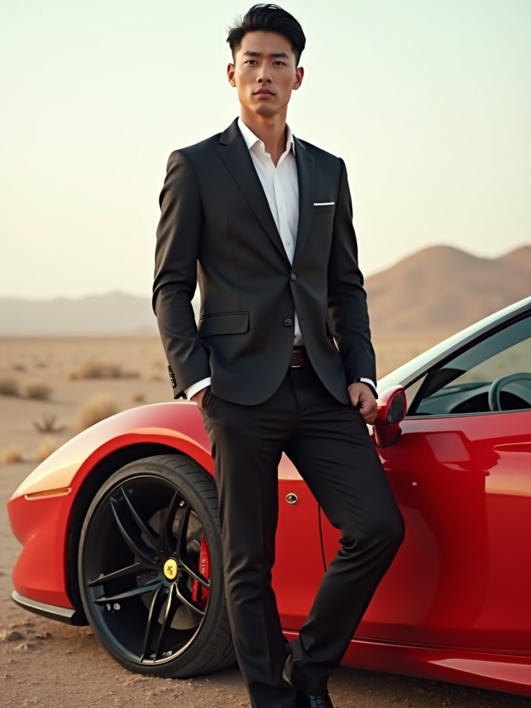 full-body shot of a confident model standing next to a red luxury ferrari sports car in a desert setting.