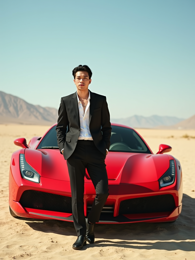 full-body shot of a confident model standing next to a red luxury ferrari sports car in a desert setting.