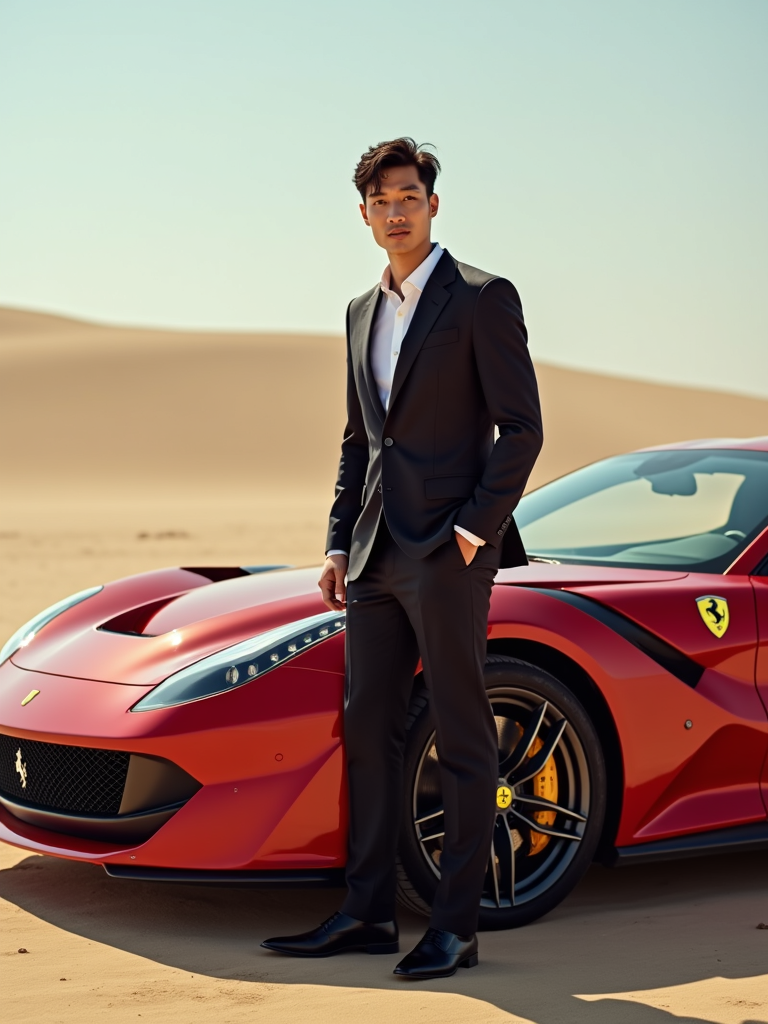 full-body shot of a confident model standing next to a red luxury ferrari sports car in a desert setting.
