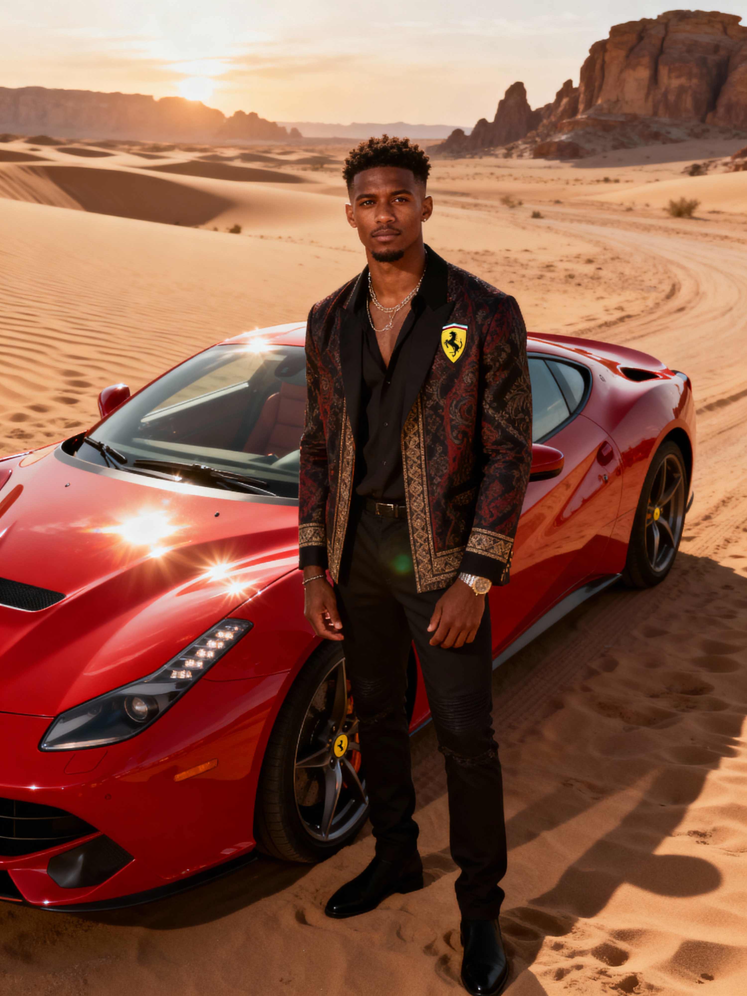full-body shot of a confident model standing next to a red luxury ferrari sports car in a desert setting.