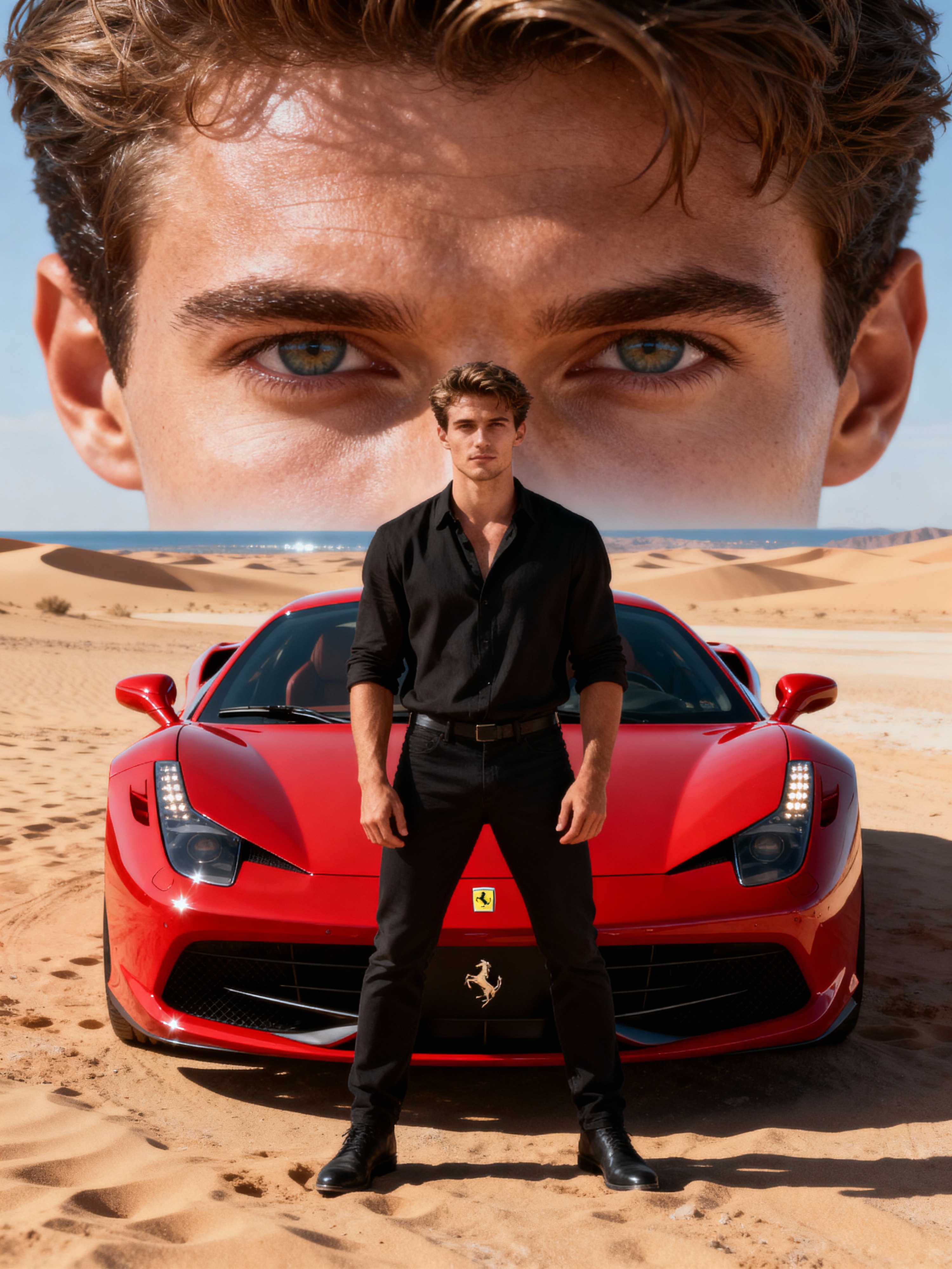 full-body shot of a confident model standing next to a red luxury ferrari sports car in a desert setting.