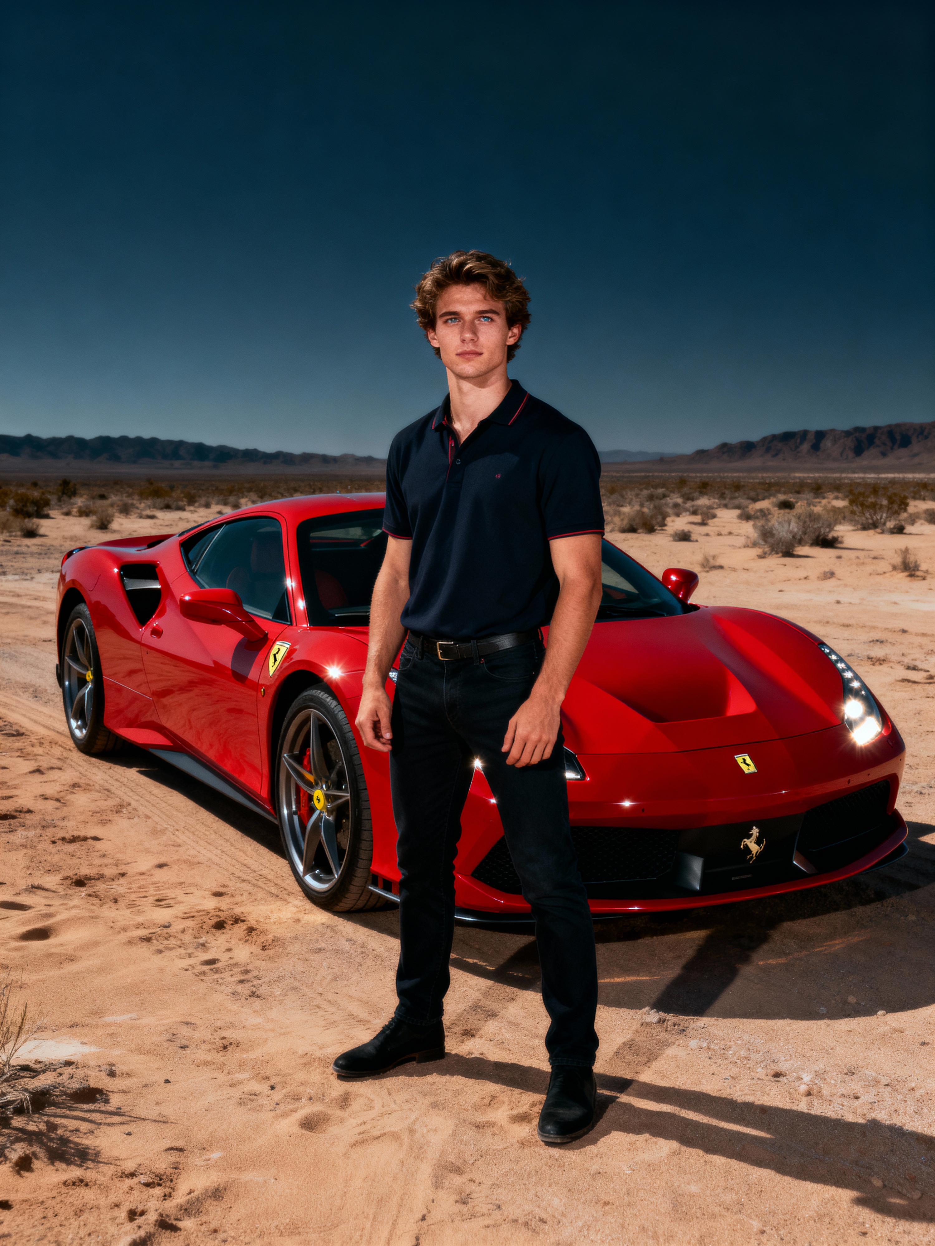 full-body shot of a confident model standing next to a red luxury ferrari sports car in a desert setting.