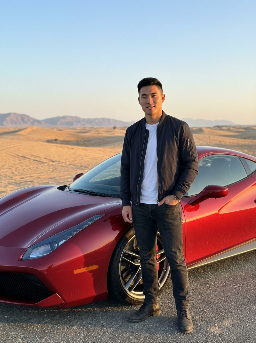 full-body shot of a confident model standing next to a red luxury ferrari sports car in a desert setting.