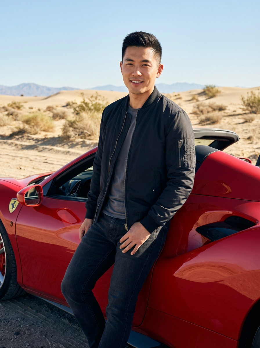 full-body shot of a confident model standing next to a red luxury ferrari sports car in a desert setting.