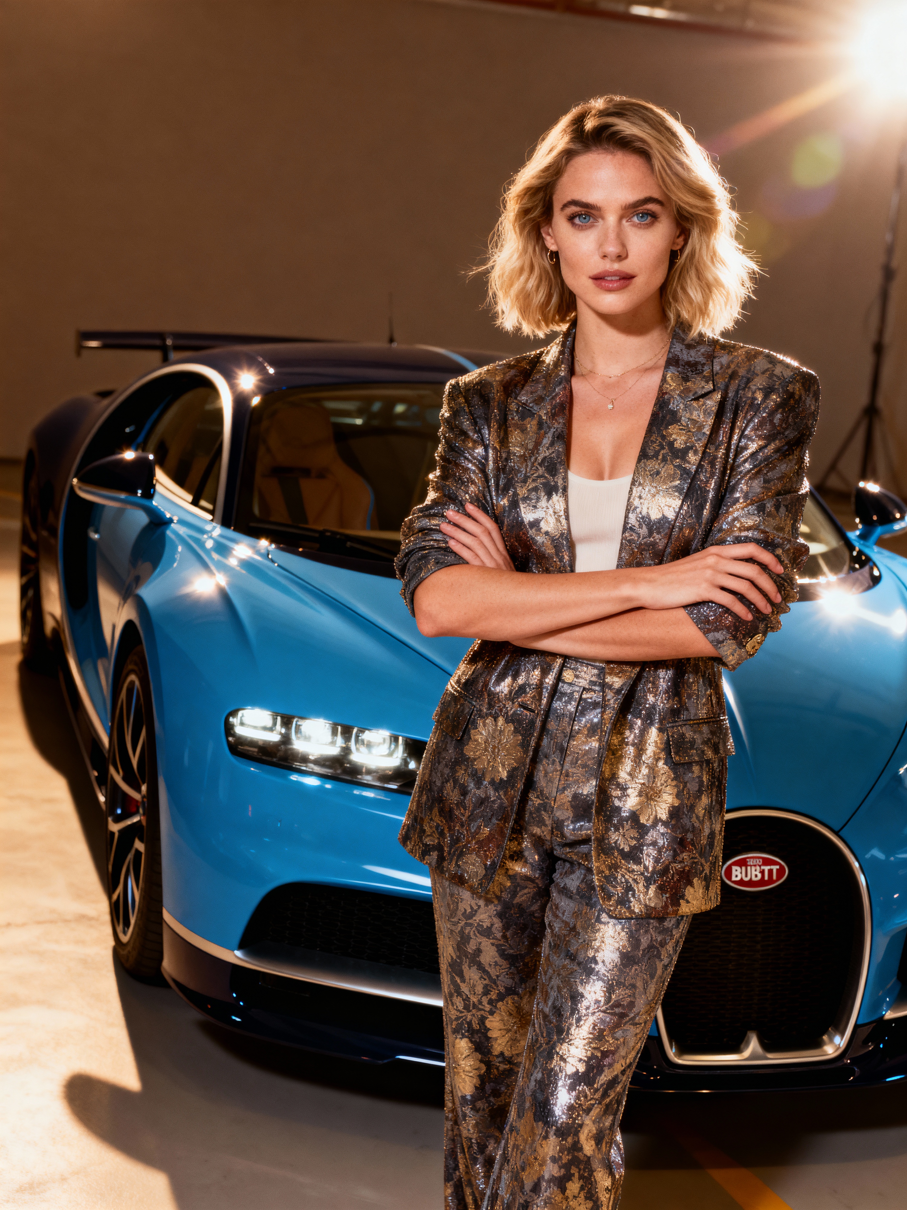 Full-body shot of a confident model standing next to a bugatti sports car. womans wears luxurious clothes
