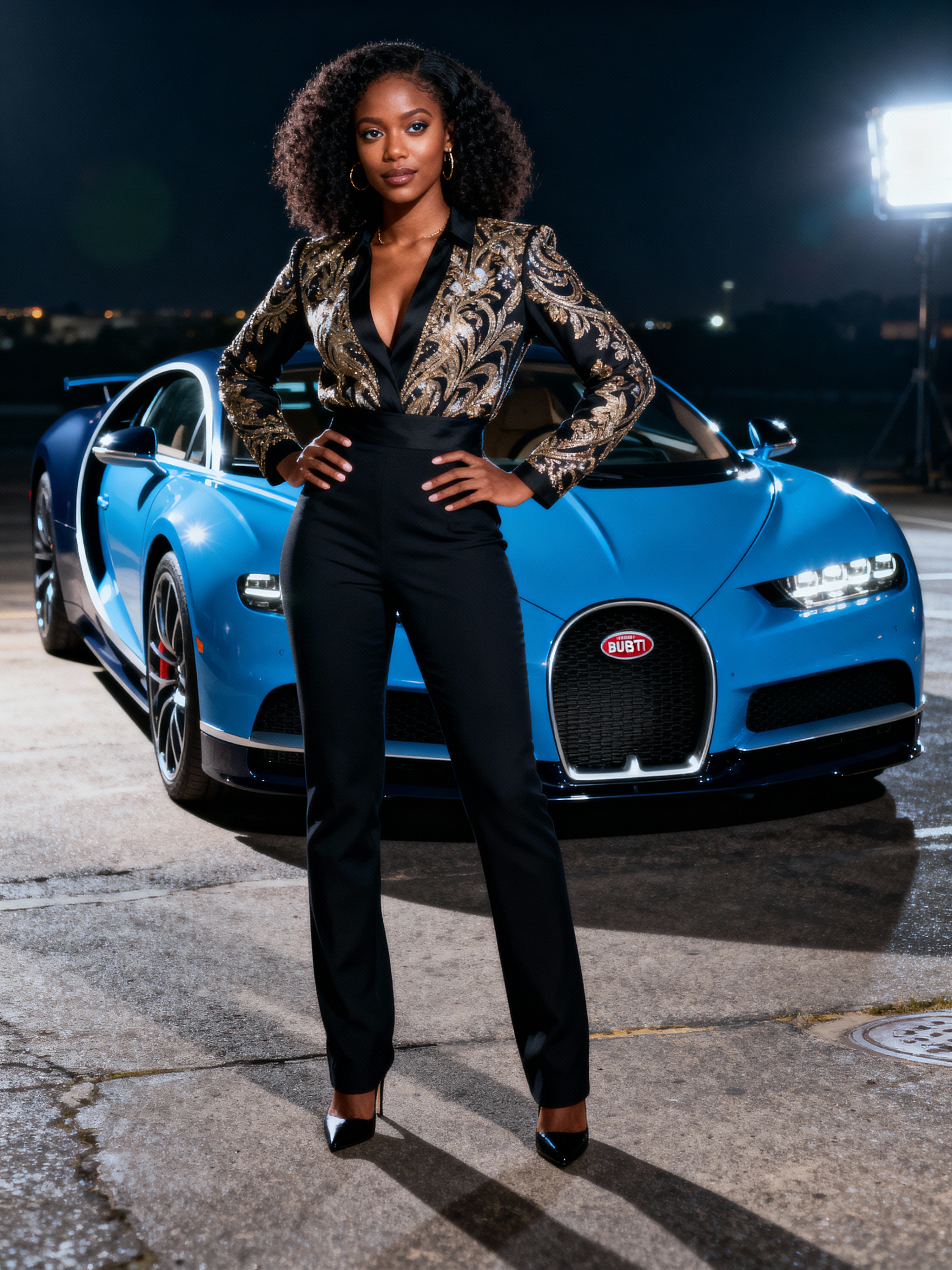 Full-body shot of a confident model standing next to a bugatti sports car. womans wears luxurious clothes