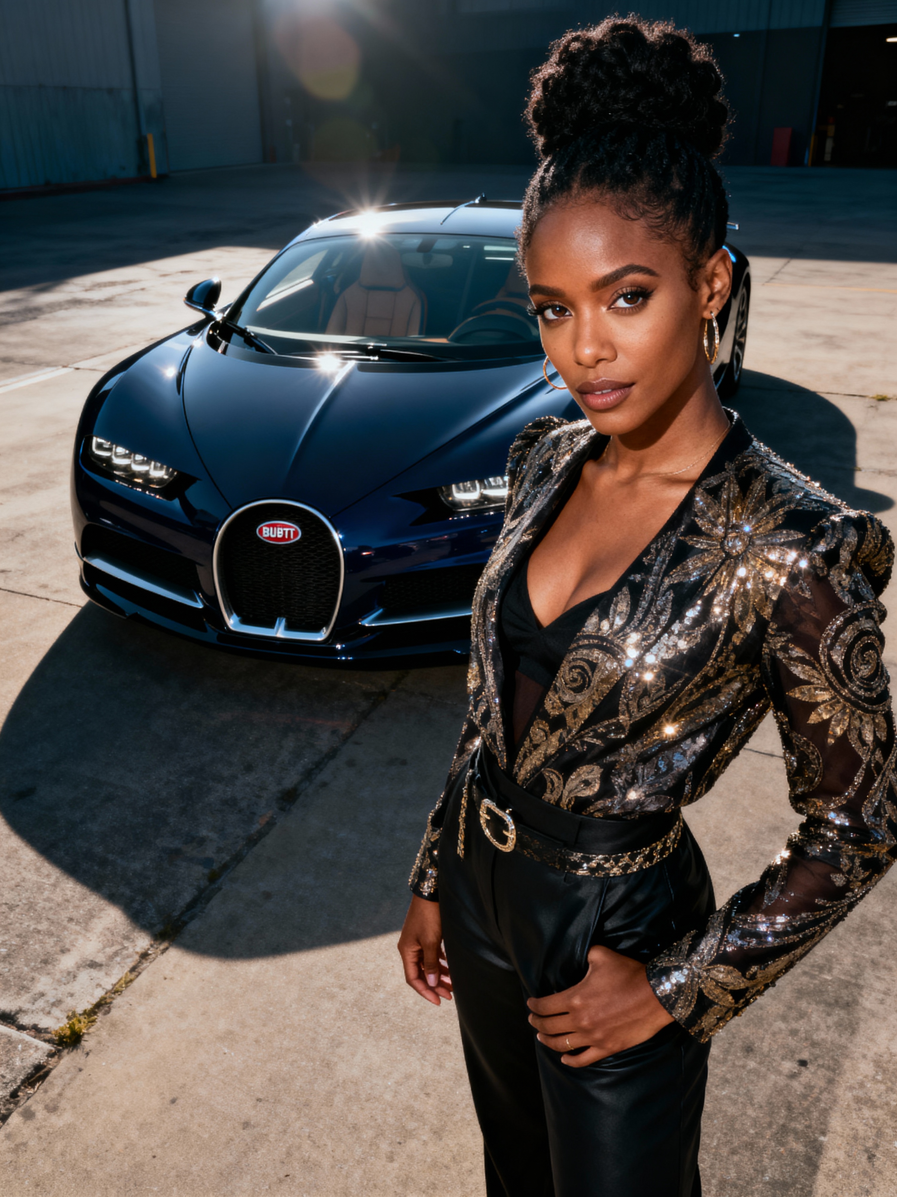 Full-body shot of a confident model standing next to a bugatti sports car. womans wears luxurious clothes