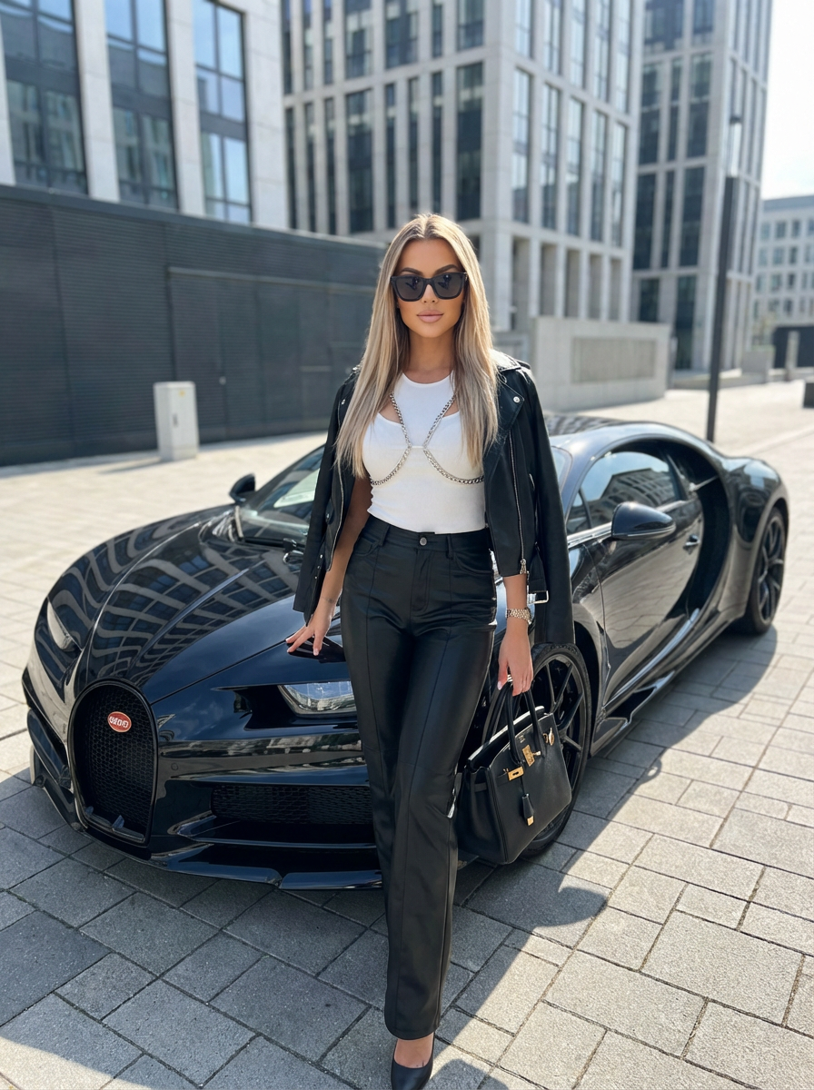 Full-body shot of a confident model standing next to a bugatti sports car. womans wears luxurious clothes