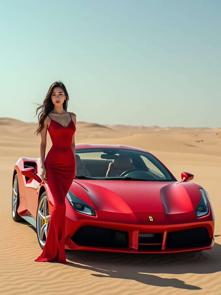 full-body shot of a confident model standing next to a red luxury ferrari sports car in a desert setting.