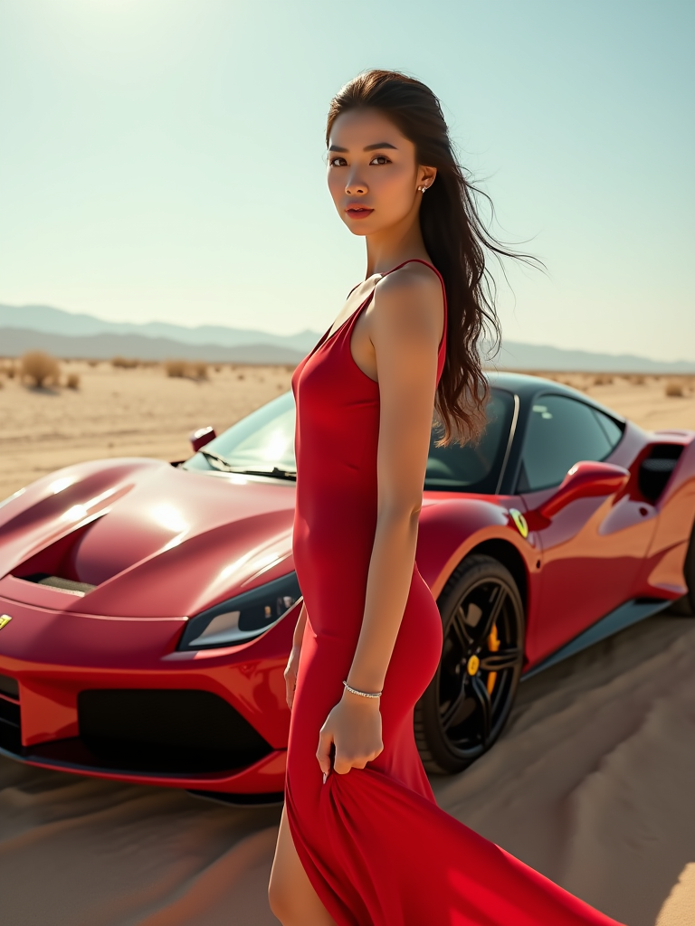 full-body shot of a confident model standing next to a red luxury ferrari sports car in a desert setting.