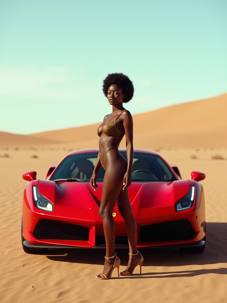 full-body shot of a confident model standing next to a red luxury ferrari sports car in a desert setting.
