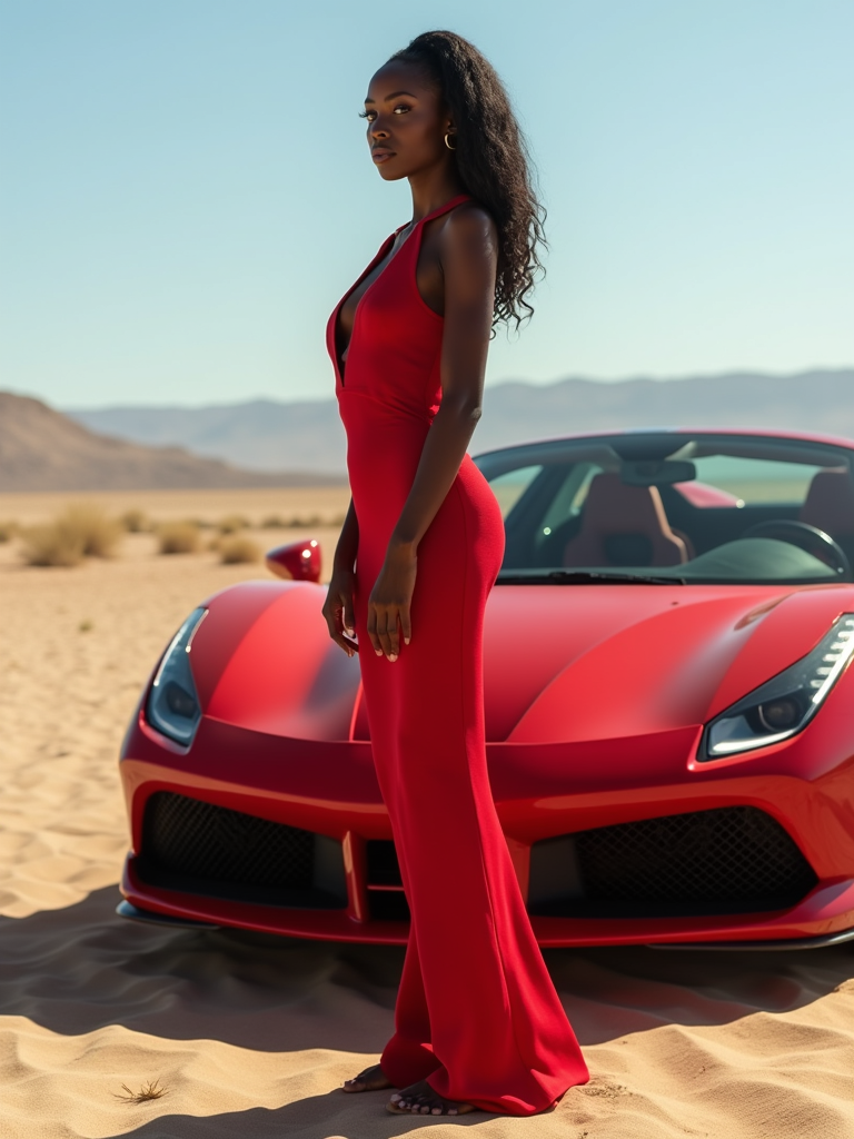 full-body shot of a confident model standing next to a red luxury ferrari sports car in a desert setting.