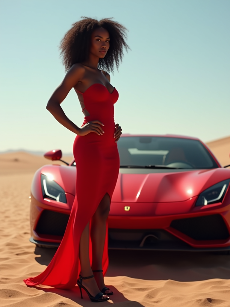 full-body shot of a confident model standing next to a red luxury ferrari sports car in a desert setting.