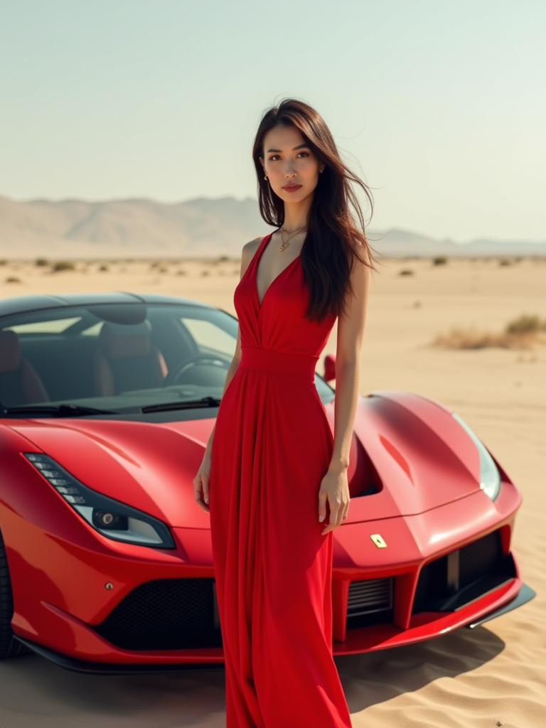full-body shot of a confident model standing next to a red luxury ferrari sports car in a desert setting.