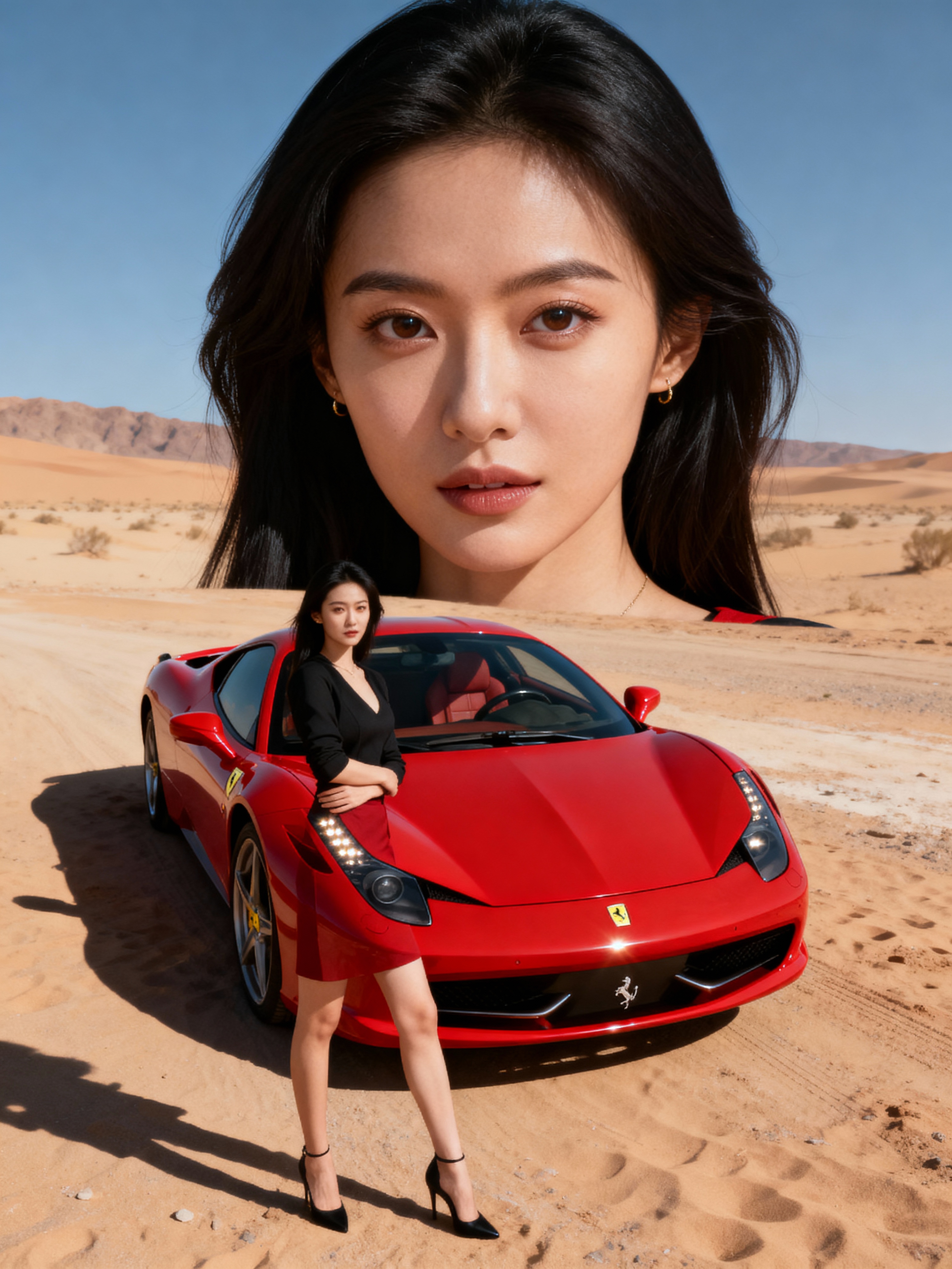 full-body shot of a confident model standing next to a red luxury ferrari sports car in a desert setting.