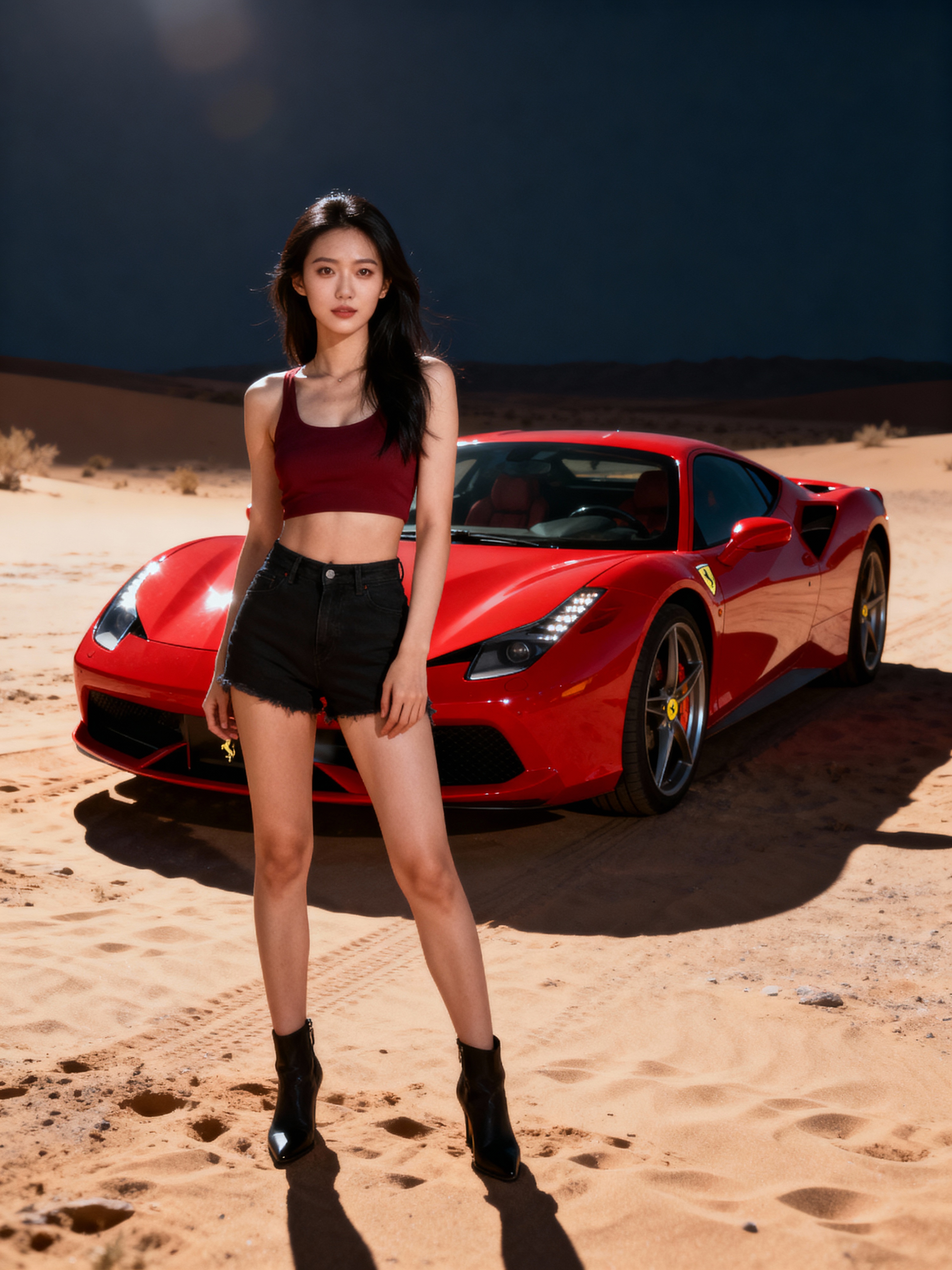 full-body shot of a confident model standing next to a red luxury ferrari sports car in a desert setting.