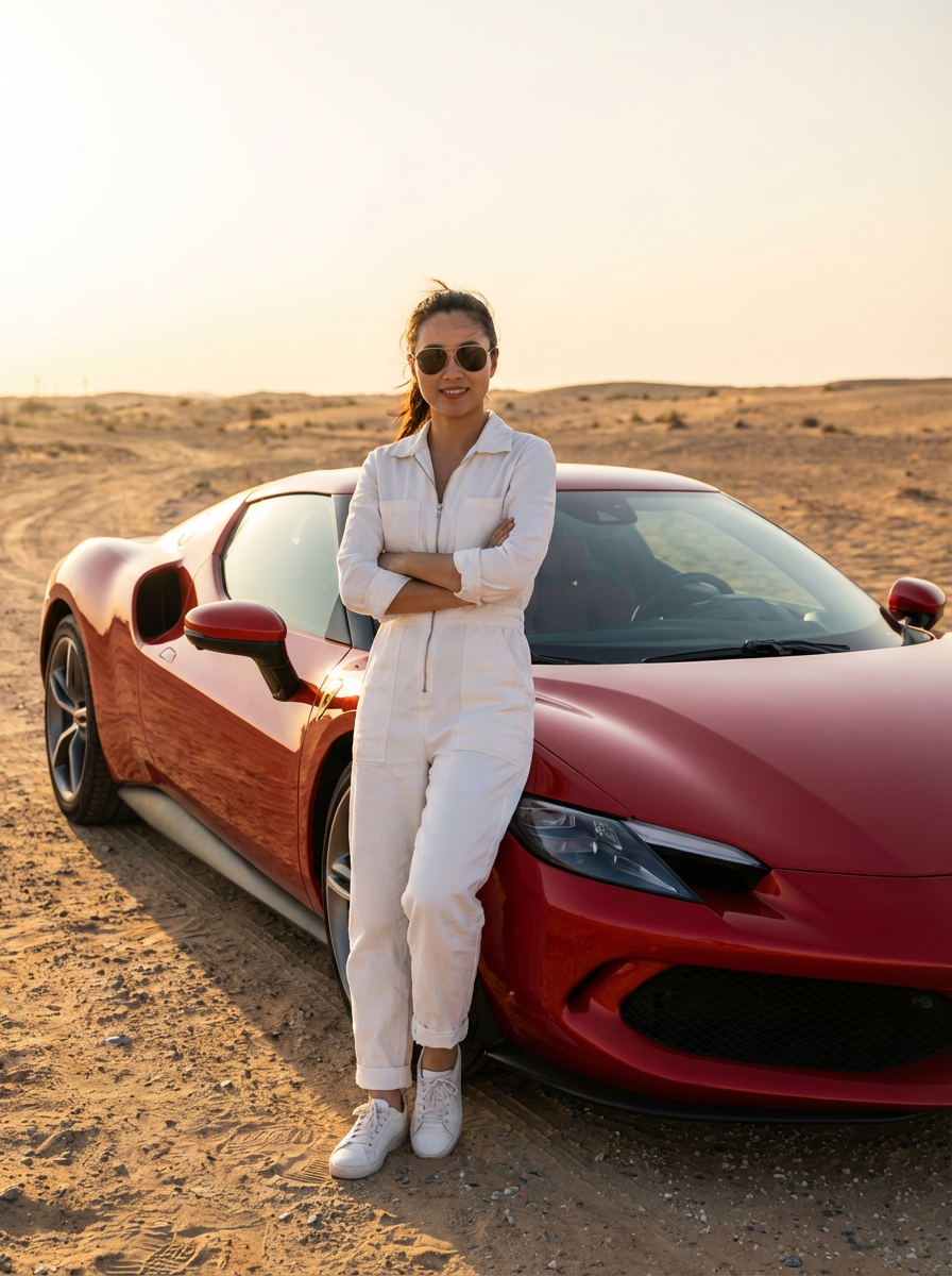 full-body shot of a confident model standing next to a red luxury ferrari sports car in a desert setting.