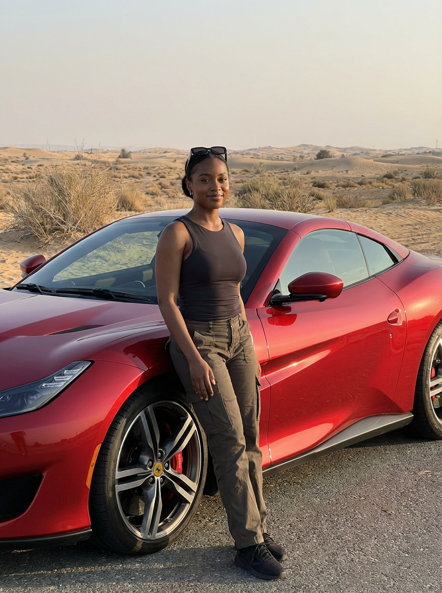 full-body shot of a confident model standing next to a red luxury ferrari sports car in a desert setting.