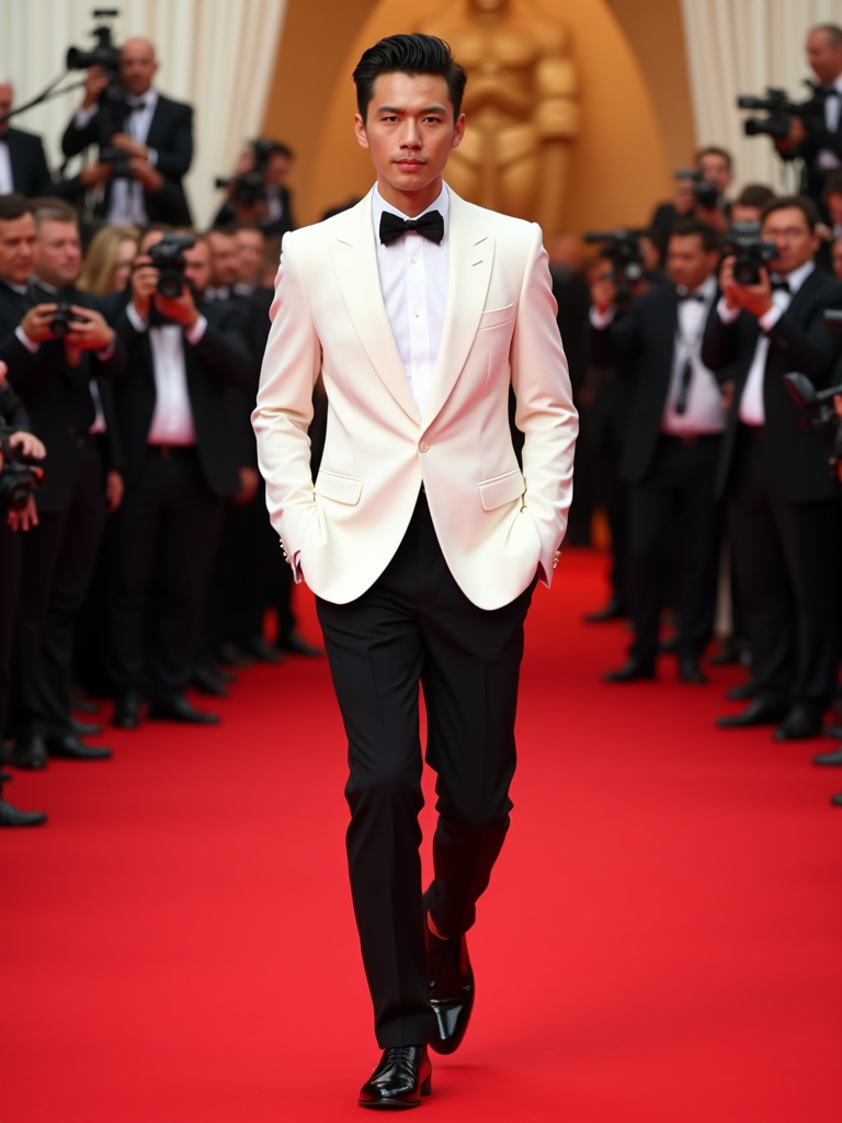 Full-body shot of a famous actor at the Cannes Film Festival, elegantly stepping onto the red carpet. The model is dressed in a tailored white tuxedo with sleek black dress shoes. The scene is filled with flashing cameras and luxurious event decorations.