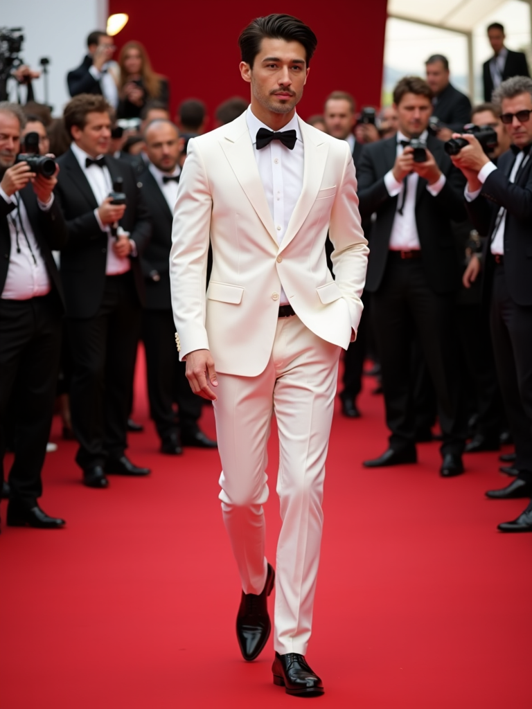 Full-body shot of a famous actor at the Cannes Film Festival, elegantly stepping onto the red carpet. The model is dressed in a tailored white tuxedo with sleek black dress shoes. The scene is filled with flashing cameras and luxurious event decorations.