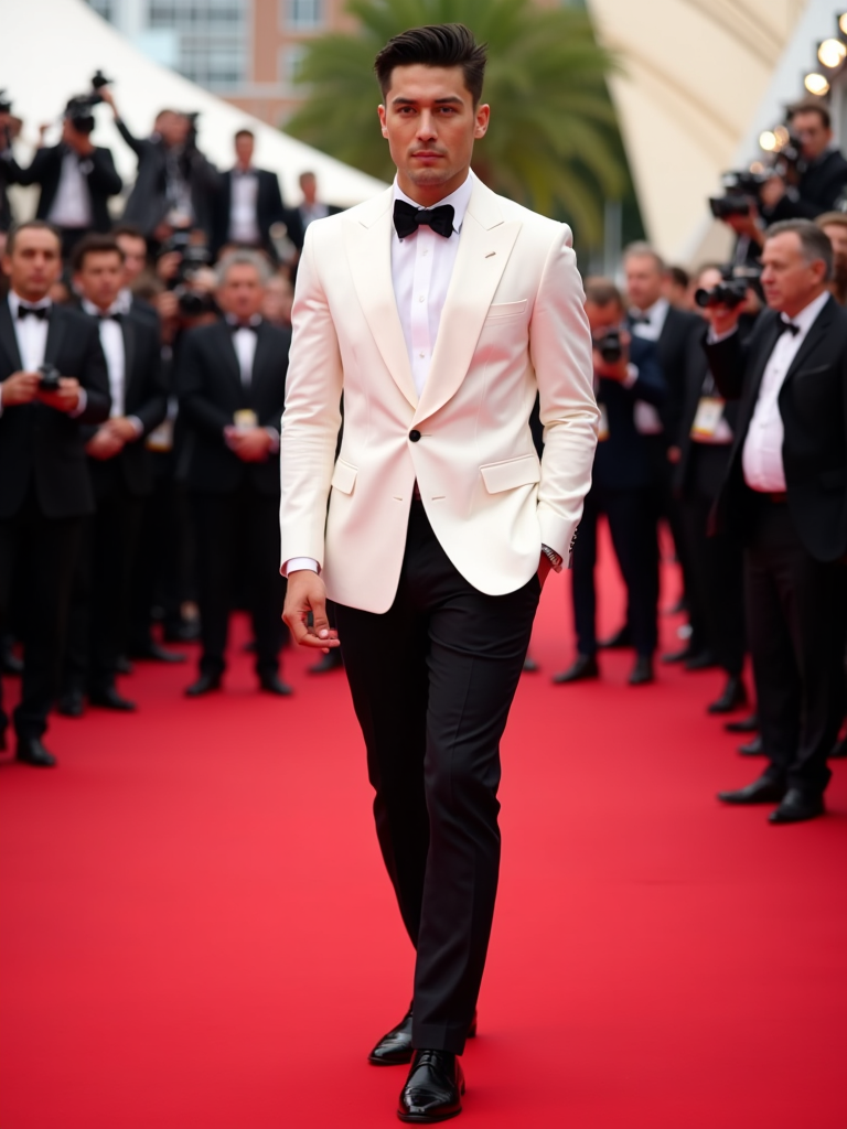 Full-body shot of a famous actor at the Cannes Film Festival, elegantly stepping onto the red carpet. The model is dressed in a tailored white tuxedo with sleek black dress shoes. The scene is filled with flashing cameras and luxurious event decorations.