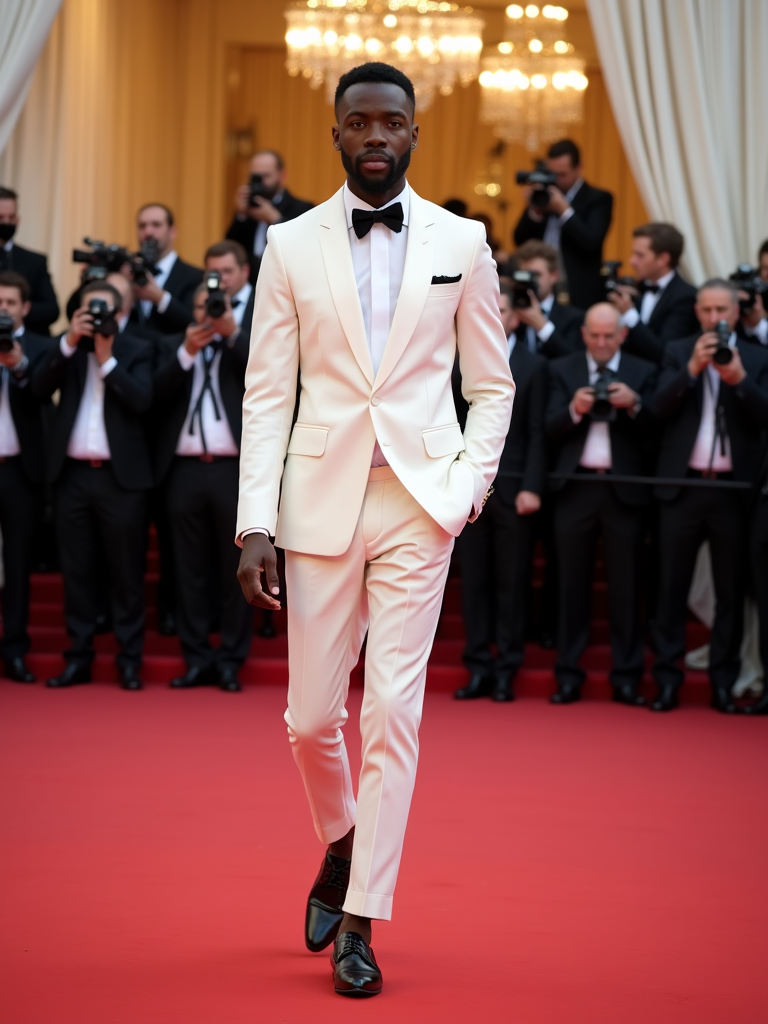 Full-body shot of a famous actor at the Cannes Film Festival, elegantly stepping onto the red carpet. The model is dressed in a tailored white tuxedo with sleek black dress shoes. The scene is filled with flashing cameras and luxurious event decorations.