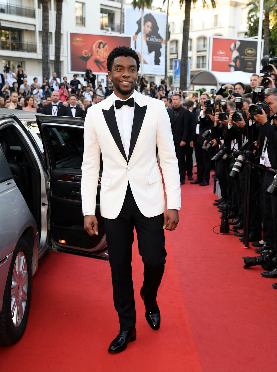 Full-body shot of a famous actor at the Cannes Film Festival, elegantly stepping onto the red carpet. The model is dressed in a tailored white tuxedo with sleek black dress shoes. The scene is filled with flashing cameras and luxurious event decorations.